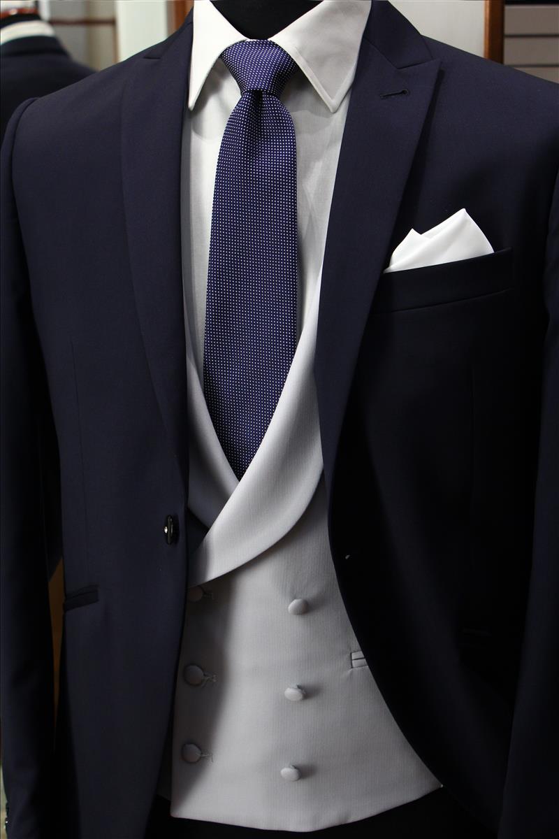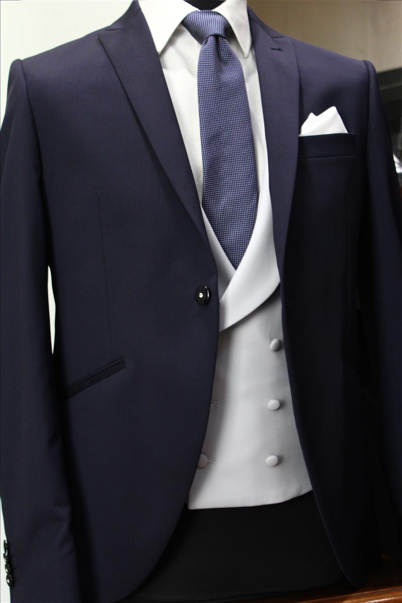 Abito petto a lancia blu medio, 1 bottone, spacco centrale tessuto Viitale Barberis Canonico,