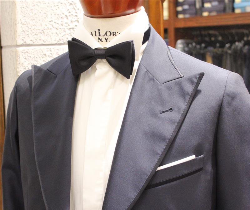Abito 1 bottone, petto a lancia largo con bordino in raso, pantalone 2 pence vita alta con cintura in raso.