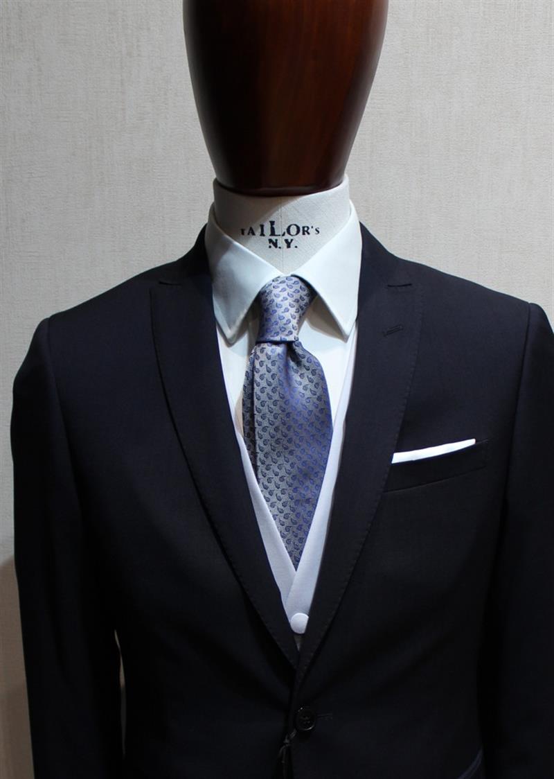 LeggiAbito blu medio con rever in raso e bottone gemello. Gilet monopetto basso con rever in raso e cravattone in raso