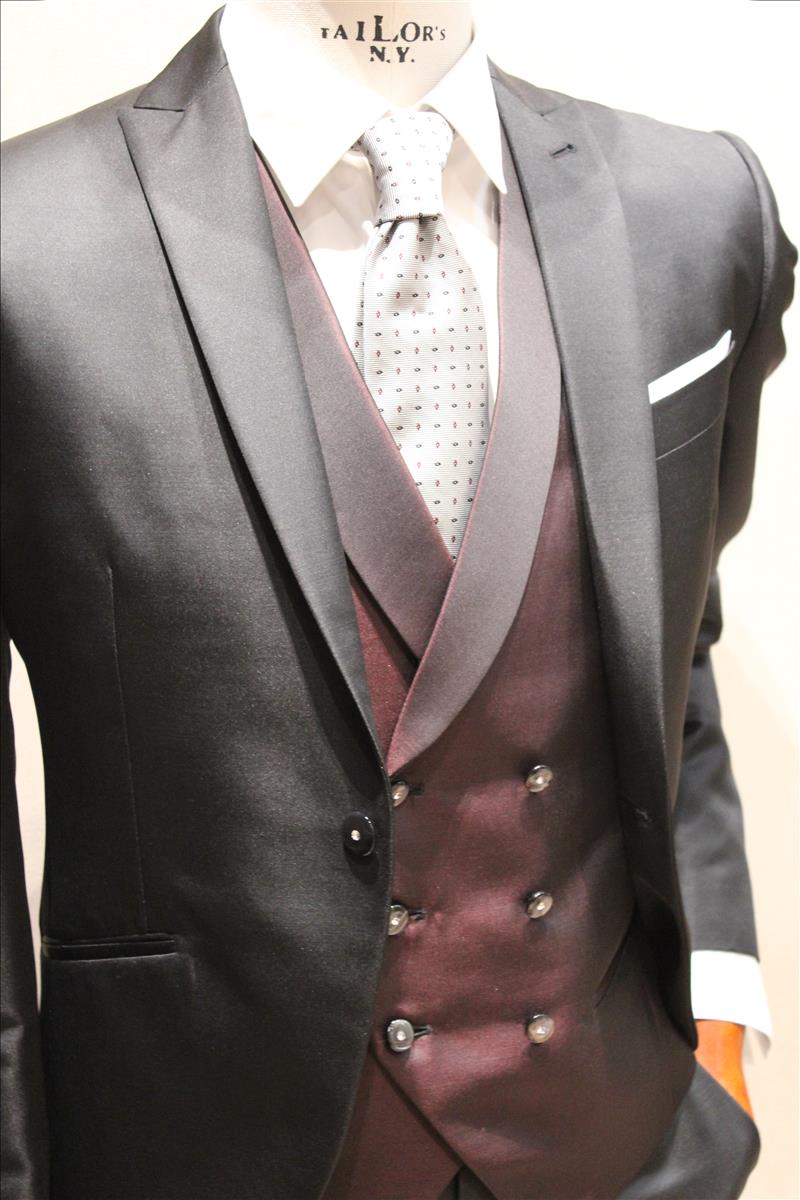 LeggiAbito nero 1 bottone con fondo leggermente aperto, gilet doppiopetto bordeaux scuro tendente al nero, cravatta con microdisegni bordeaux.