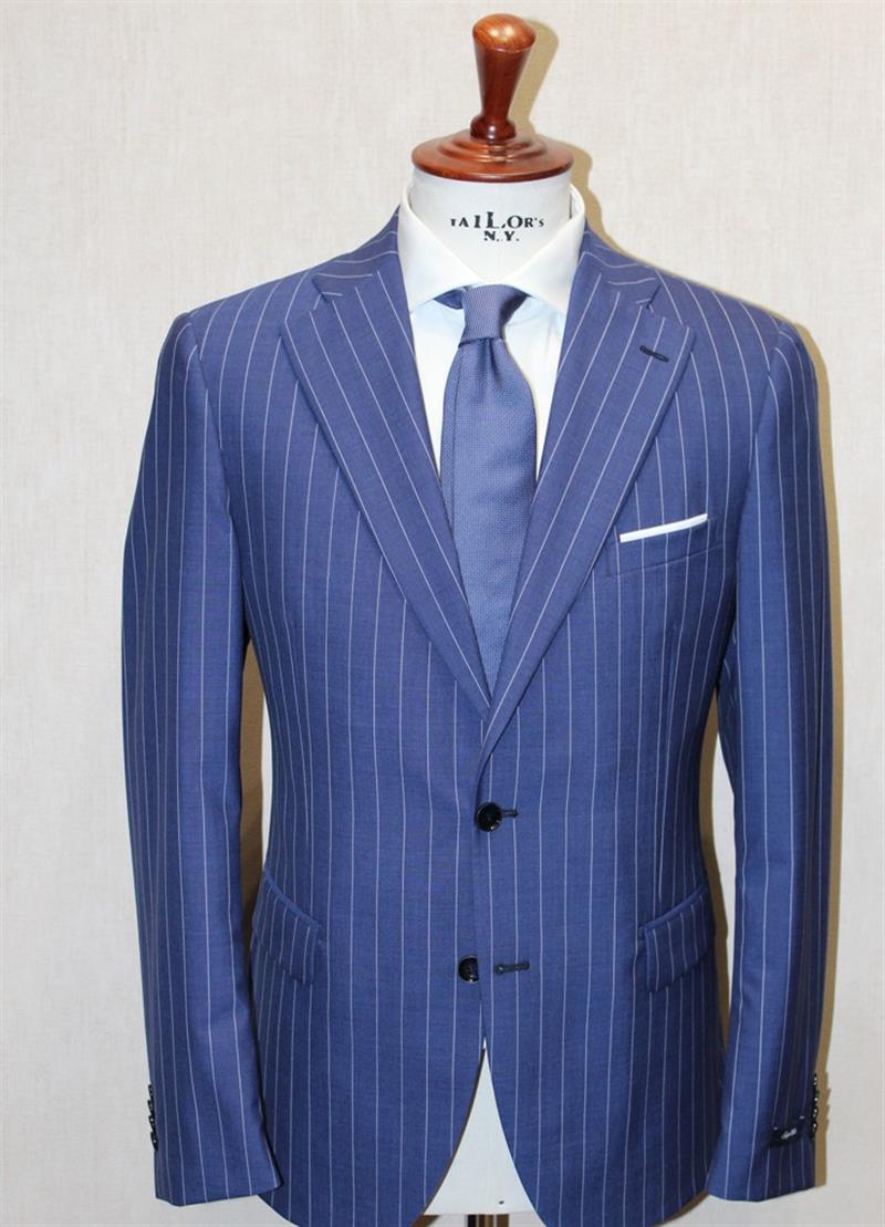 Abito Gessato, petto a lancia blu riga rossa, Modello; 2 bottoni, ticket pocket, spacchi laterali, Vestibilità; Drop 7 laggermente asciutta Tessuto; Super 130's Fratelli Tallia di Delfino Listino € 590,00 Offerta € 450,00