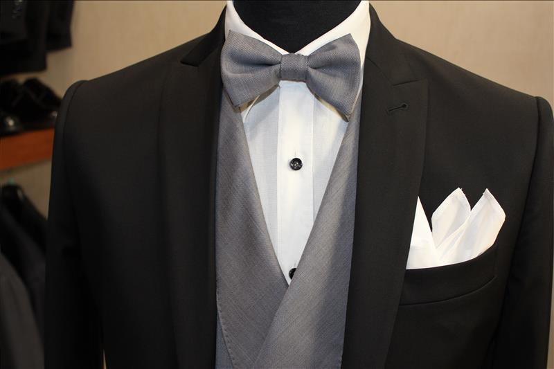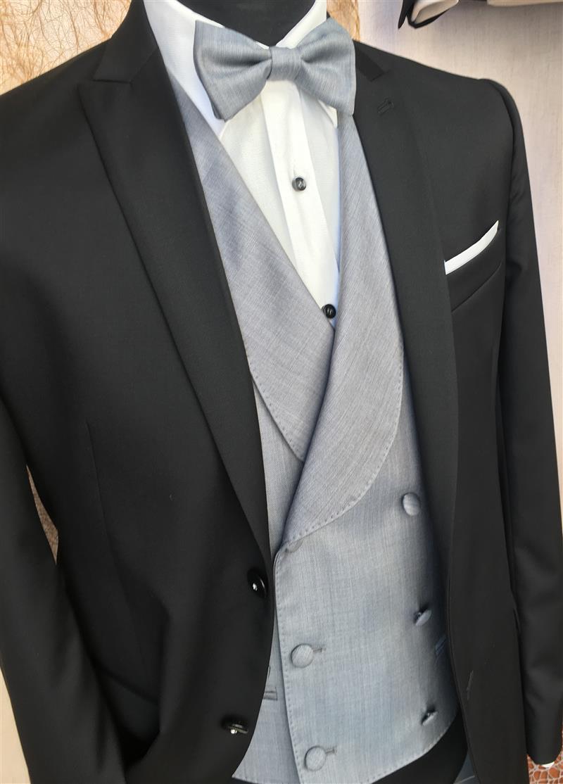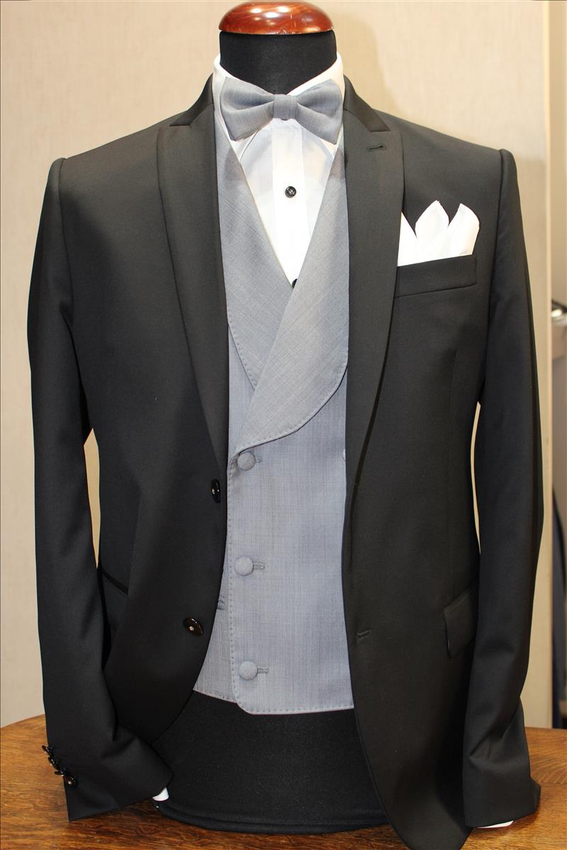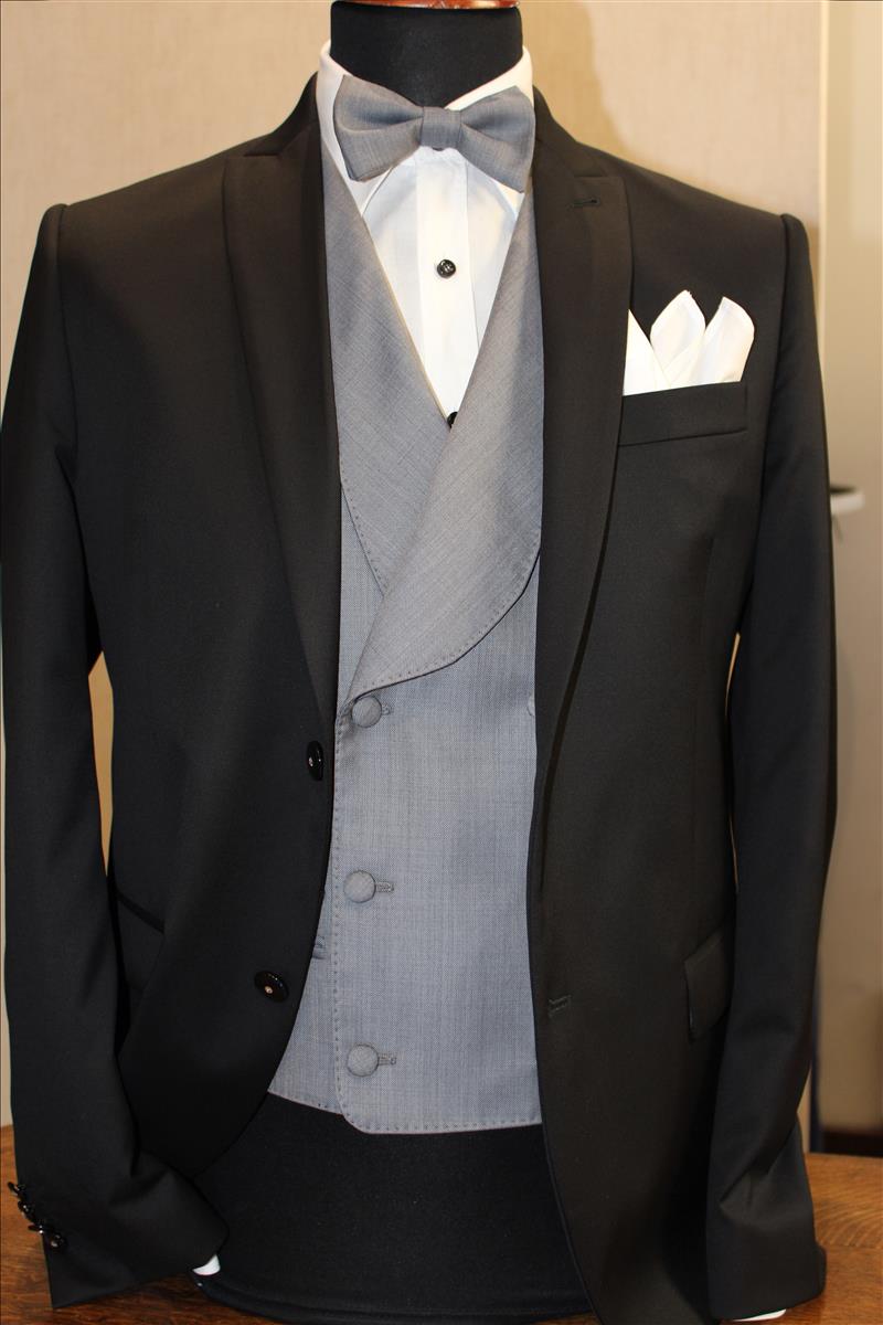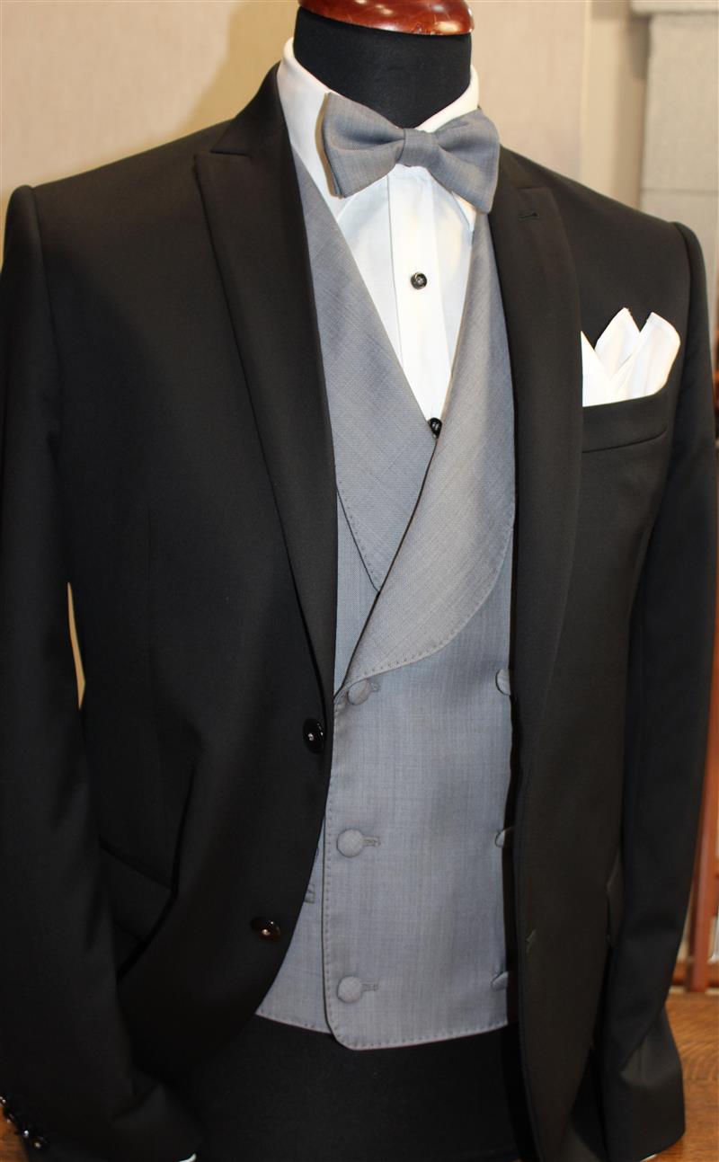 Abito 2 bottoni,petto a lancia, 1 spacco, tex in pura lana Vitale Barberis Canonico, gilet grigio chiaro doppiopetto, in pura lana tex Drago con papillon abbinato