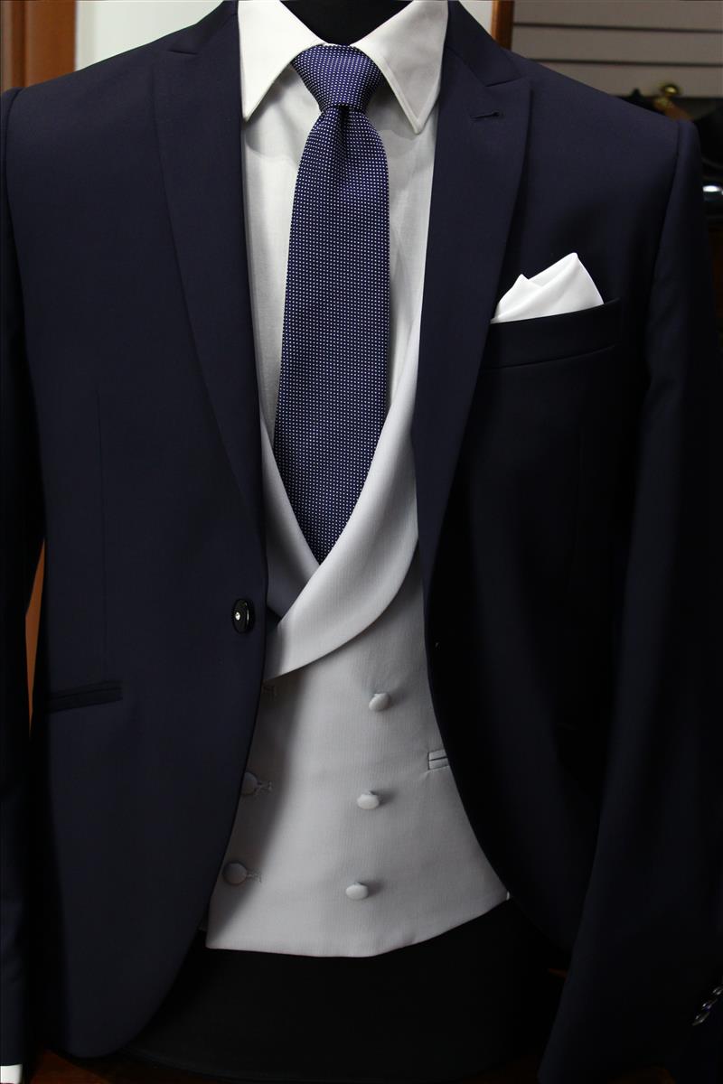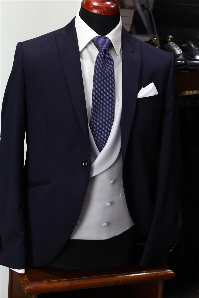 Abito petto a lancia blu medio, 1 bottone, spacco centrale tessuto Viitale Barberis Canonico,