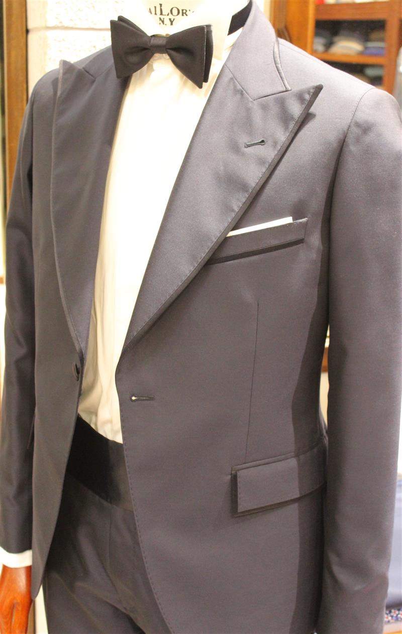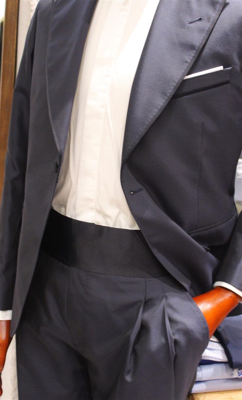 Abito 1 bottone, petto a lancia largo con bordino in raso, pantalone 2 pence vita alta con cintura in raso.