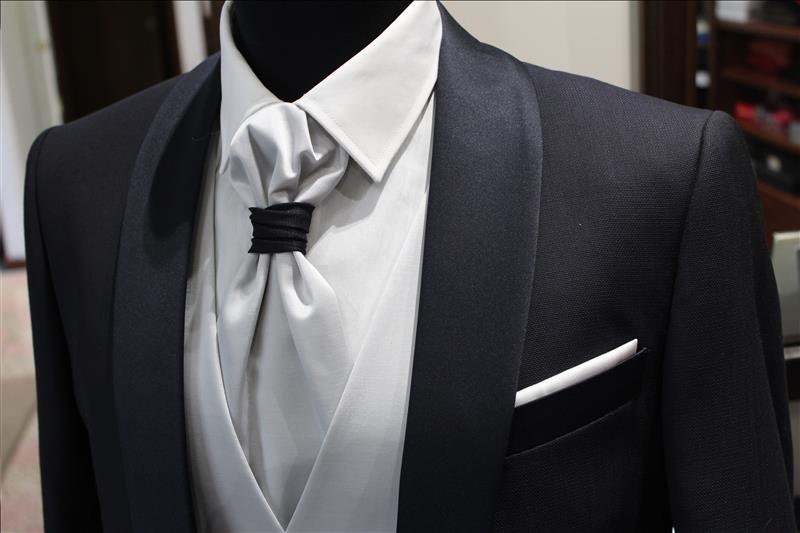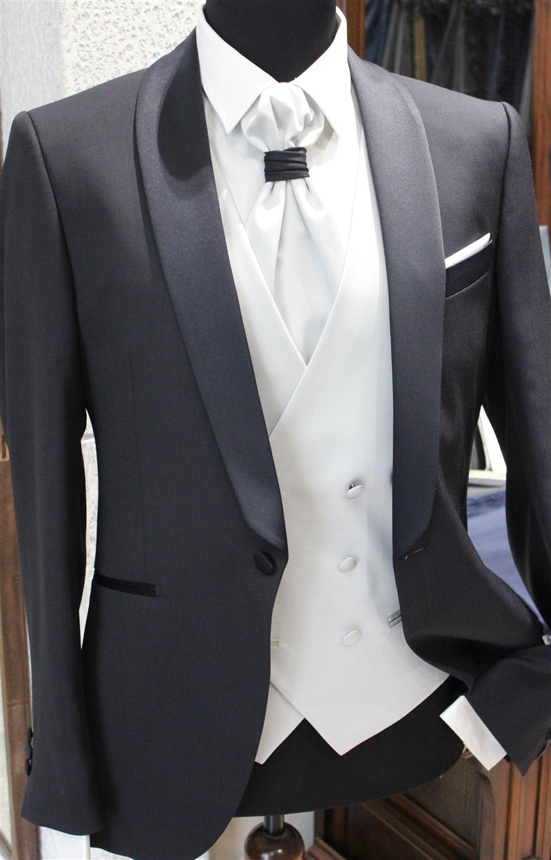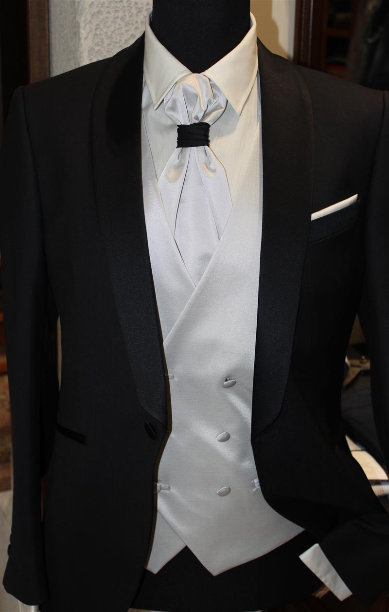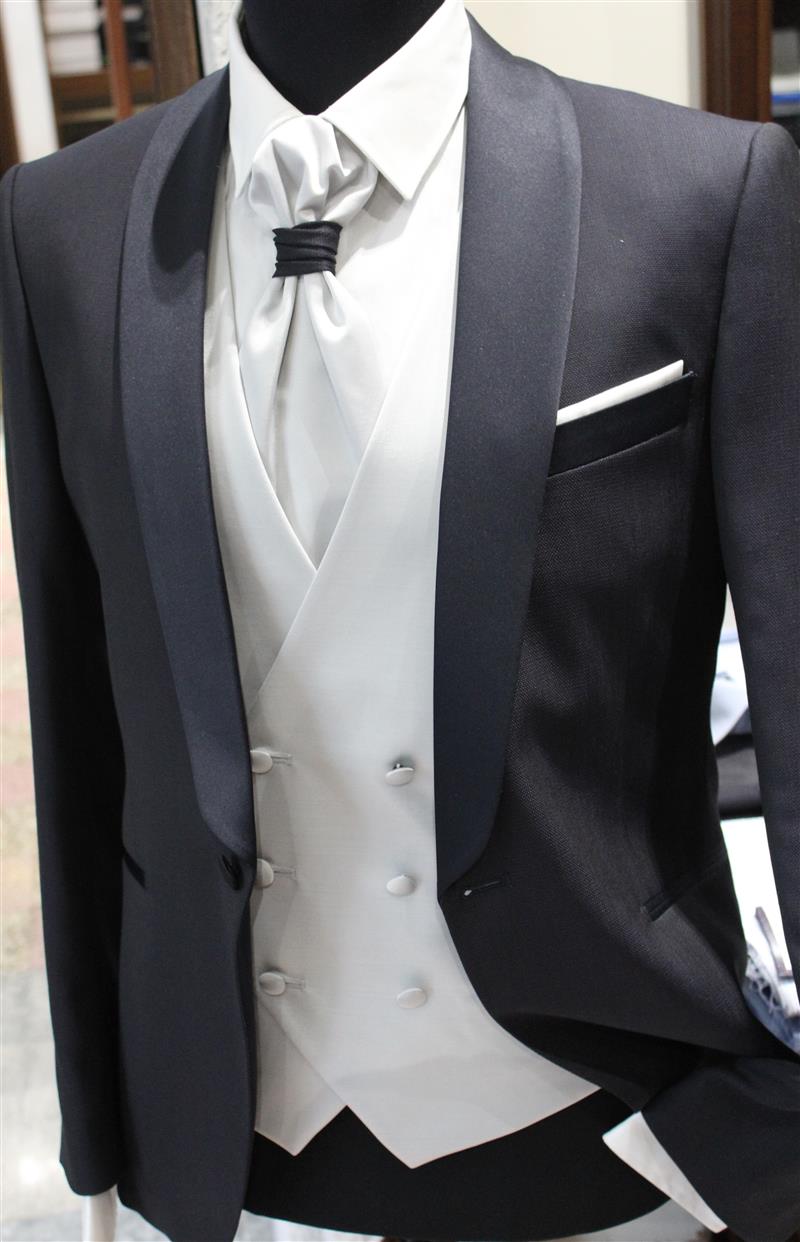 colore blu scuro, gilet grigio perla doppiopetto,