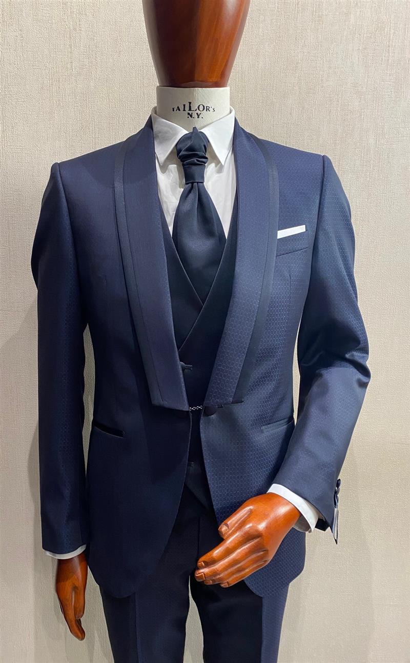 Smoking collo sciallato con bottone gemello, tessuto lana/seta micro fantasia, gilet raso blu doppiopetto, cravatta raso blu