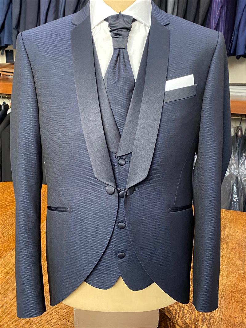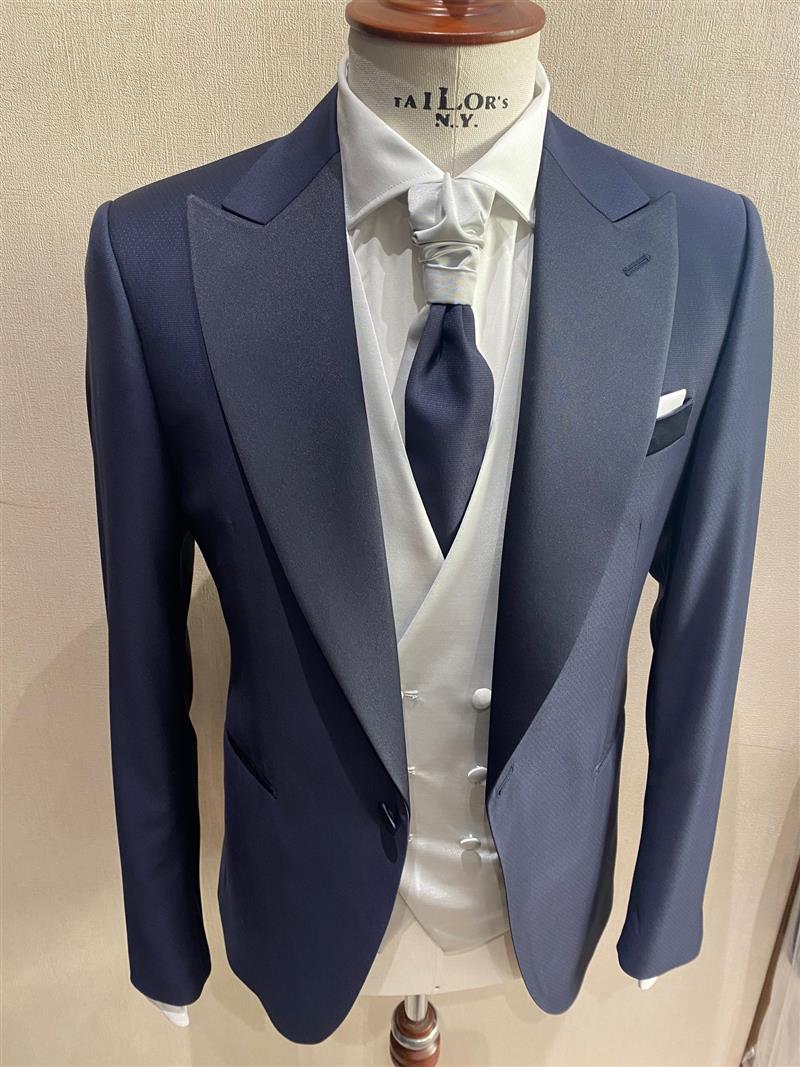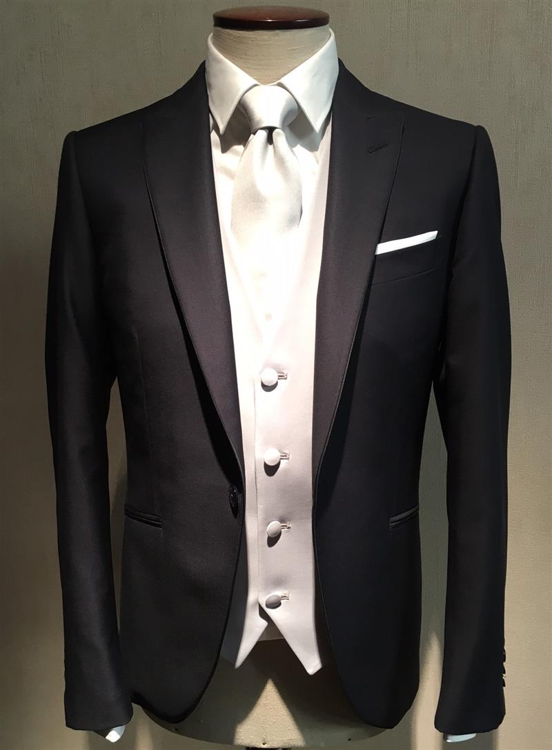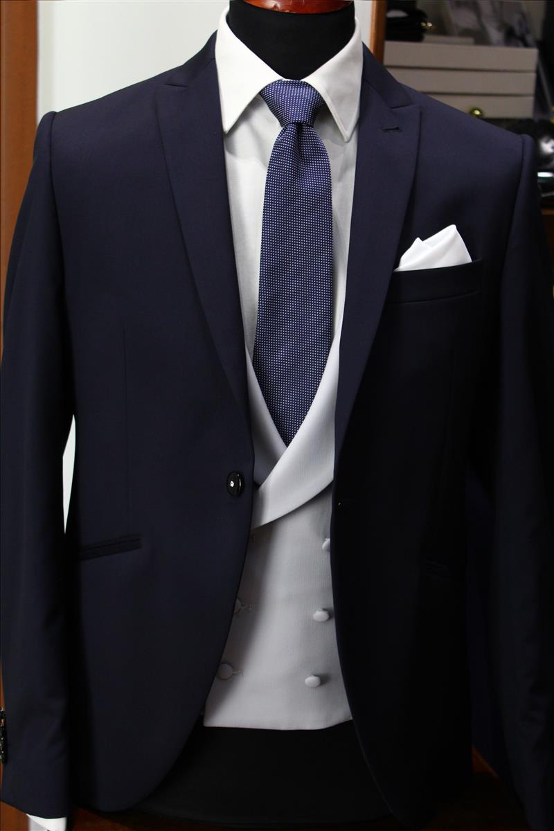 LeggiAbito blu medio con rever in raso e bottone gemello. Gilet monopetto basso con rever in raso e cravattone in raso