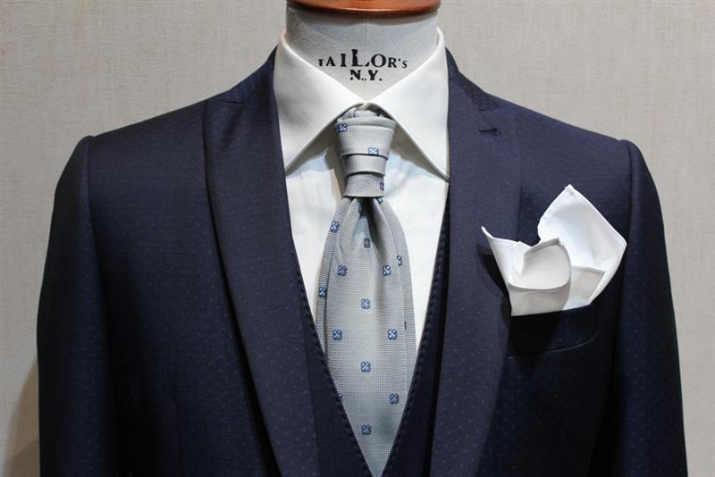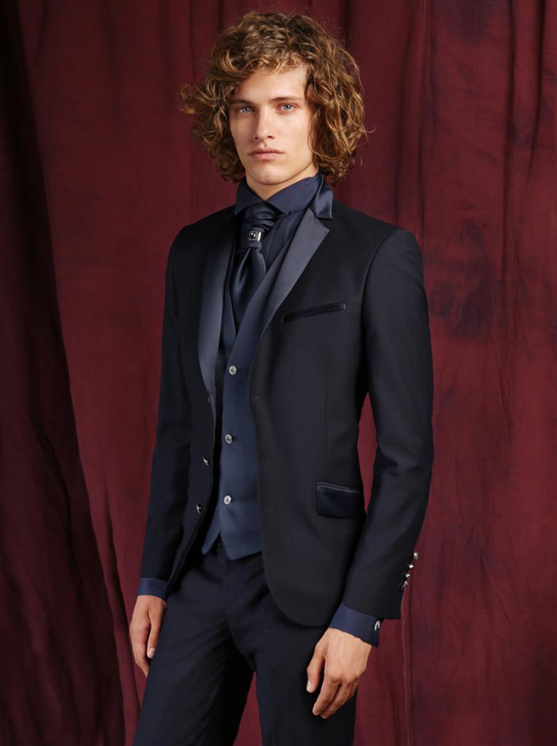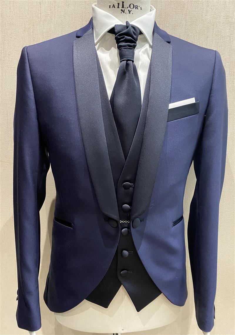 LeggiSmoking blu in tessuto operato, con Gilet e cravattone in raso blu.