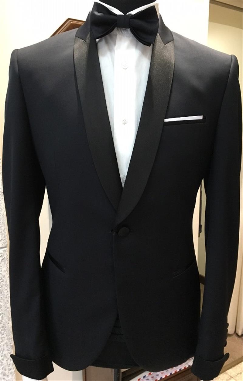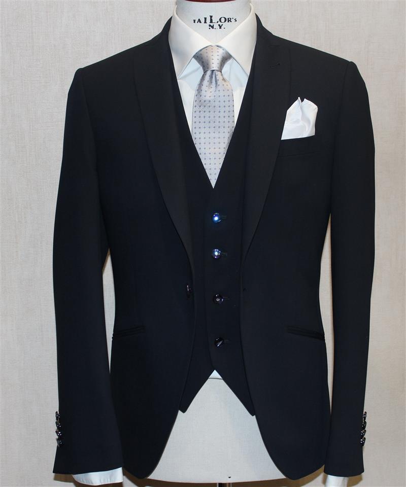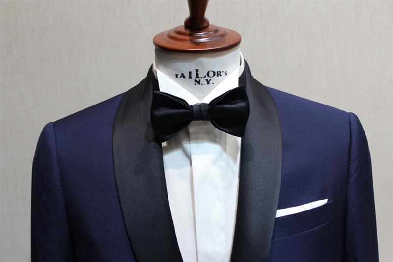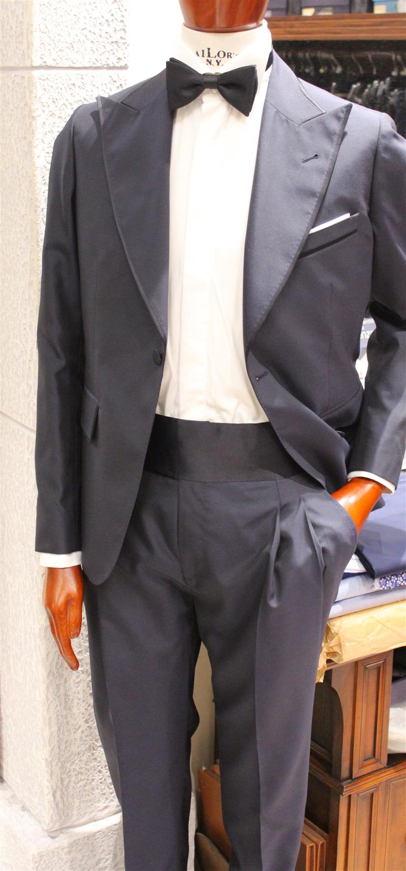LeggiSmoking collo sciallato con bottone gemello, tessuto lana/seta micro fantasia, gilet raso blu doppiopetto, cravatta raso blu