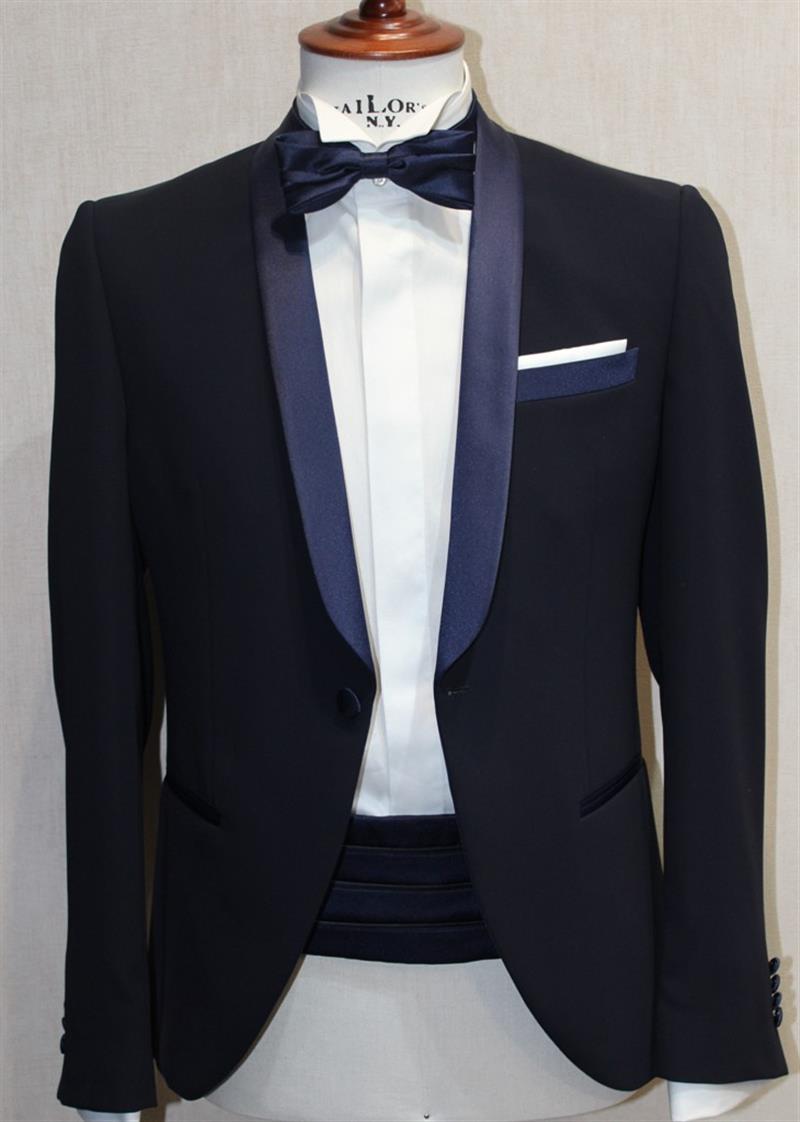 LeggiSmoking 100% superfine Australian Wool 110's, colore blu, rever largo in raso blu, 1 bottone, senza spacchi.